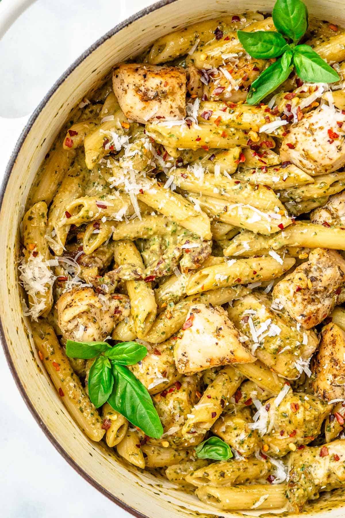 Al dente penne pasta with crispy chicken tossed in Basil pesto sauce, made with garlic, parmesan and extra virgin olive oil.